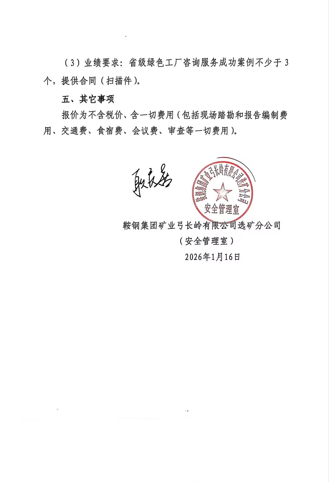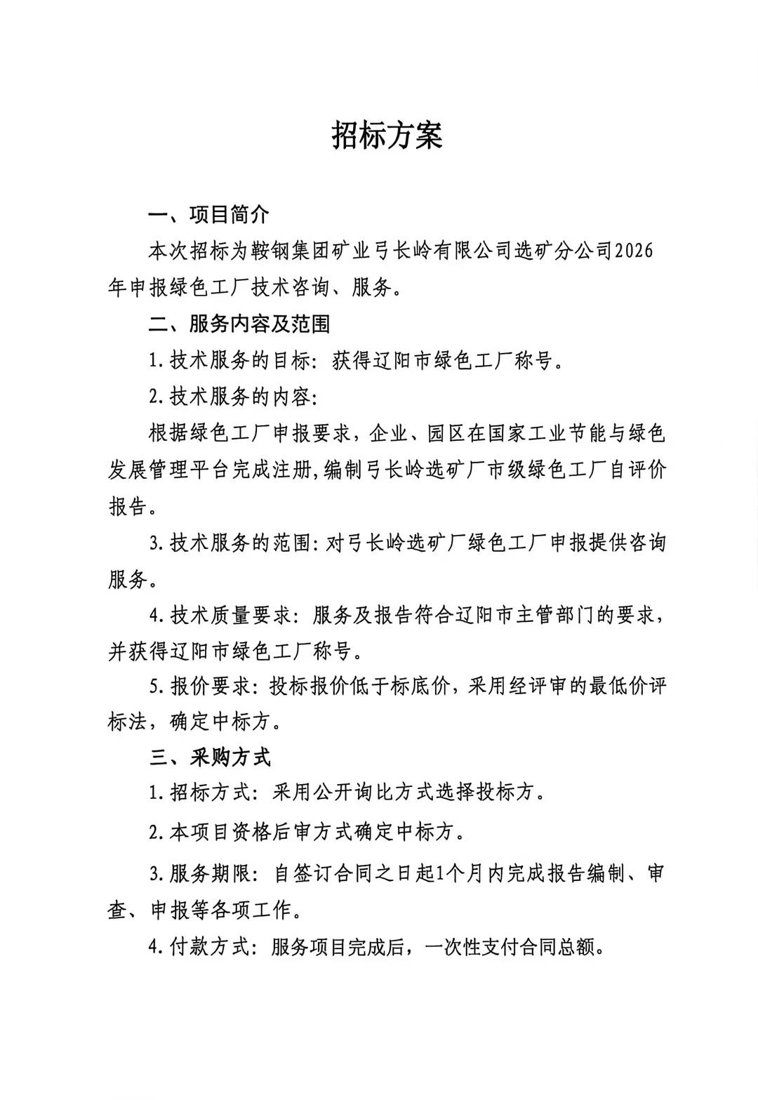 本采购项目弓选厂2026年绿色工厂申报技术服务(AGGKXKFGXHD260128265809)采购人为鞍钢集团矿业弓长岭有限公司选矿分公司生产技术室(安全管理室),采购项目资金来自自筹,该项目已具备采购条件,现进行公开询比。